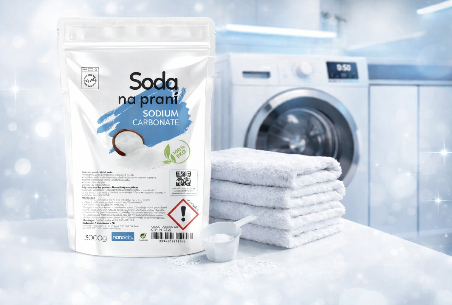 Soda na praní proniká do vláken tkaniny a efektivně odstraňuje nečistoty a skvrny. Její alkalické vlastnosti také neutralizují kyselé skvrny, jako je pot nebo víno.